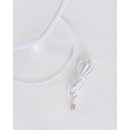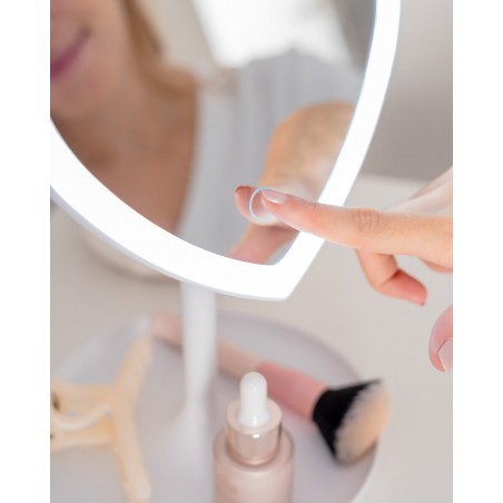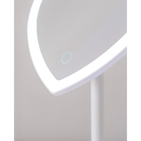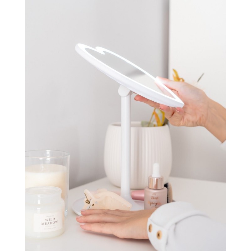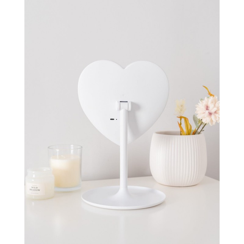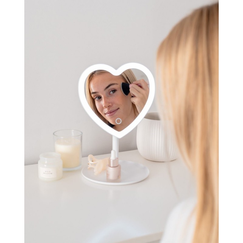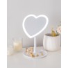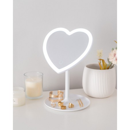 Le nouveau miroir en forme de cœur avec éclairage LED est doté d'une base pour ranger bijoux, cosmétiques, etc., et d'un bouton tactile pour régler l'intensité lumineuse.