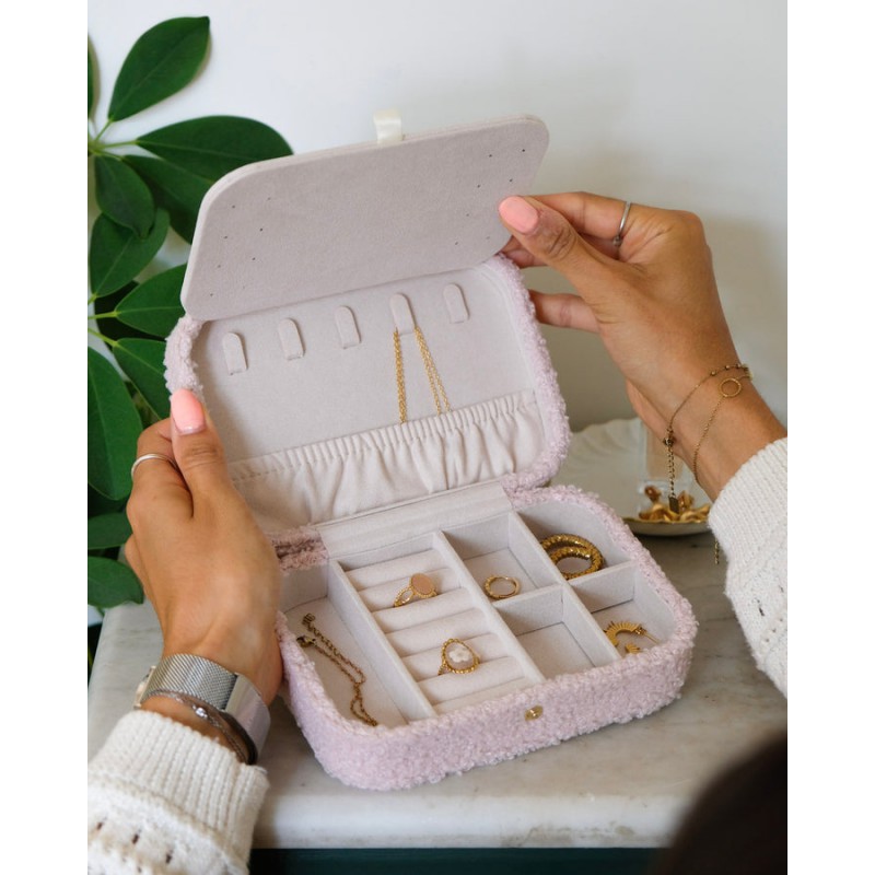 Brigitte en moumoute est la plus grande boîte à bijoux de voyage de la collection. Vous pourrez y emporter en toute sécurité plusieurs dizaines de bijoux lors de vos vacances et autres déplacements. Mais rassurez-vous, elle n’en demeure pas moins compacte, pratique et facile à glisser dans une valise.