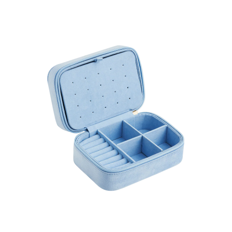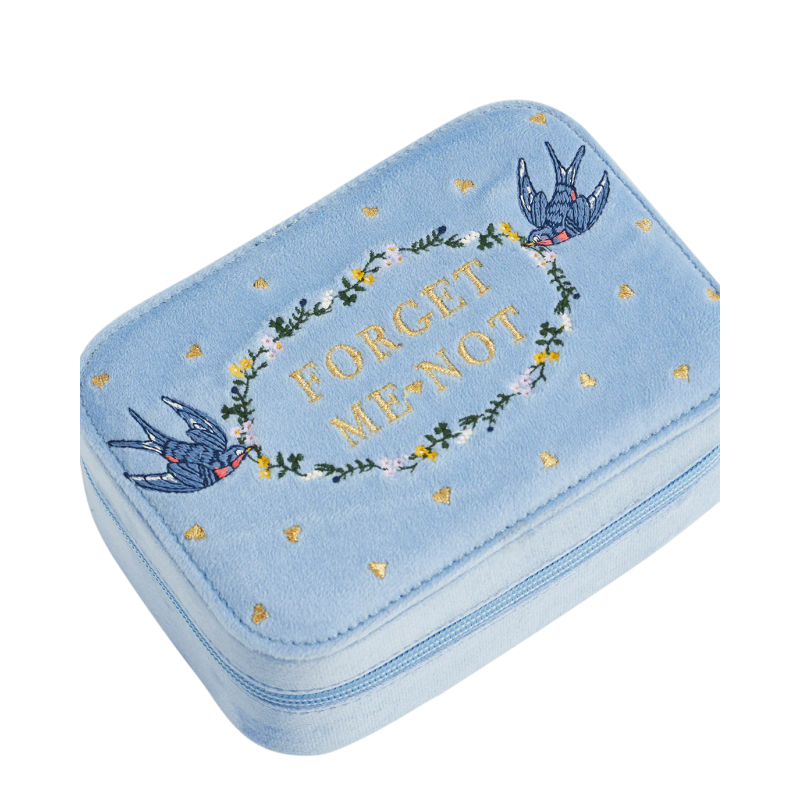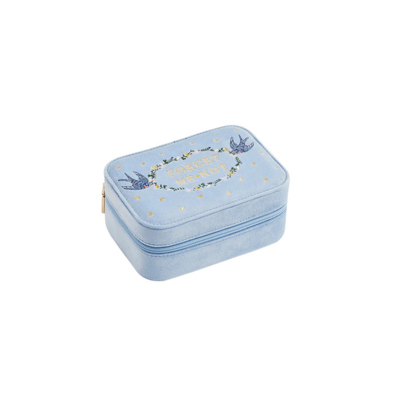 Conservez précieusement vos souvenirs les plus chers dans le grand coffret à bijoux brodé en velours bleu « Myosotis ». Recouvert d'un velours pastel moelleux et orné de délicats oiseaux bleus portant une couronne de fleurs sur laquelle est inscrit « Myosotis », ce coffret célèbre les souvenirs et les émotions dans le plus pur style Fable.