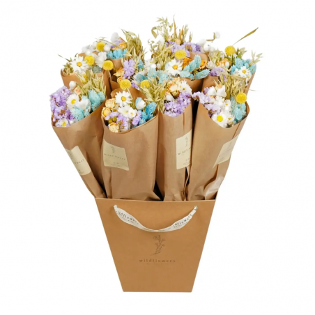 Issu de leur collection Printemps-Été, ce bouquet champêtre et joyeux, aux accents de marché, est comme ceux que vous trouveriez chez votre fleuriste préféré. Composé d'avoine naturelle, de phalaris bleu clair, de craspedia, de rhodanthe blanche, de statice lavande et de roses branchues Trinity, il est idéal pour créer une ambiance douce et élégante aux teintes pastel. Chaque bouquet est confectionné à la main avec soin pour un rendu naturel et authentique.