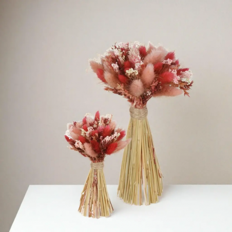 Le bouquet présente un mélange harmonieux de fleurs séchées aux tons doux de rosewood, créant un look naturel et sophistiqué, idéal pour les étagères, tables, comptoirs ou présentoirs de cadeaux.