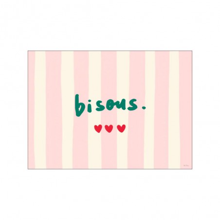 Une affiche pleine de fantaisie, ornée du mot « Bisous » en français. Avec son lettrage audacieux et son fond à rayures modernes, elle apporte une touche parisienne douce et colorée aux chambres, aux murs de cadres et aux intérieurs contemporains. Décoration murale idéale pour les passionnés de design et les amoureux de Paris et de la France.
