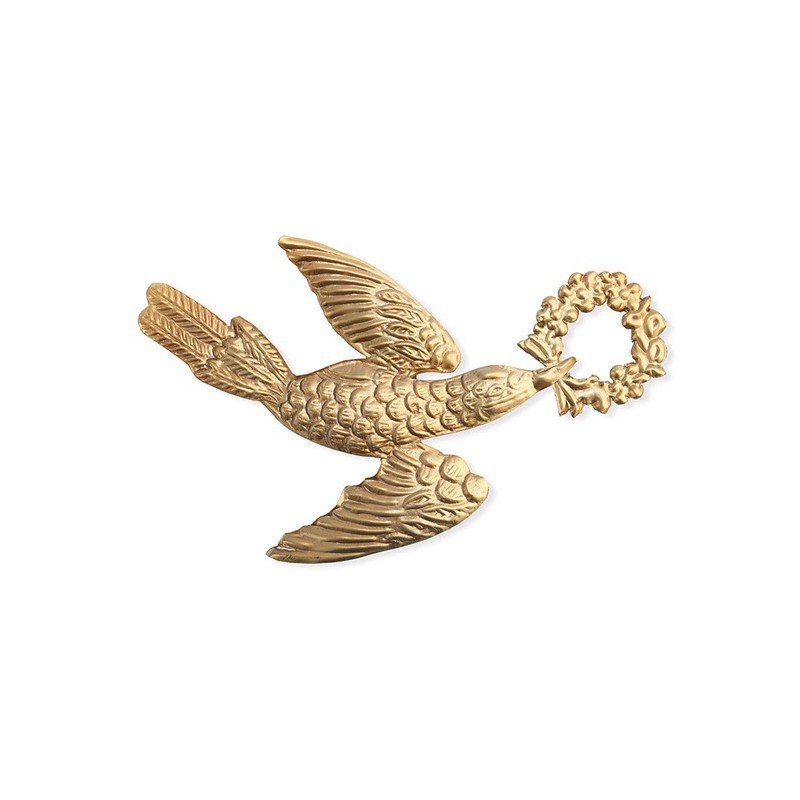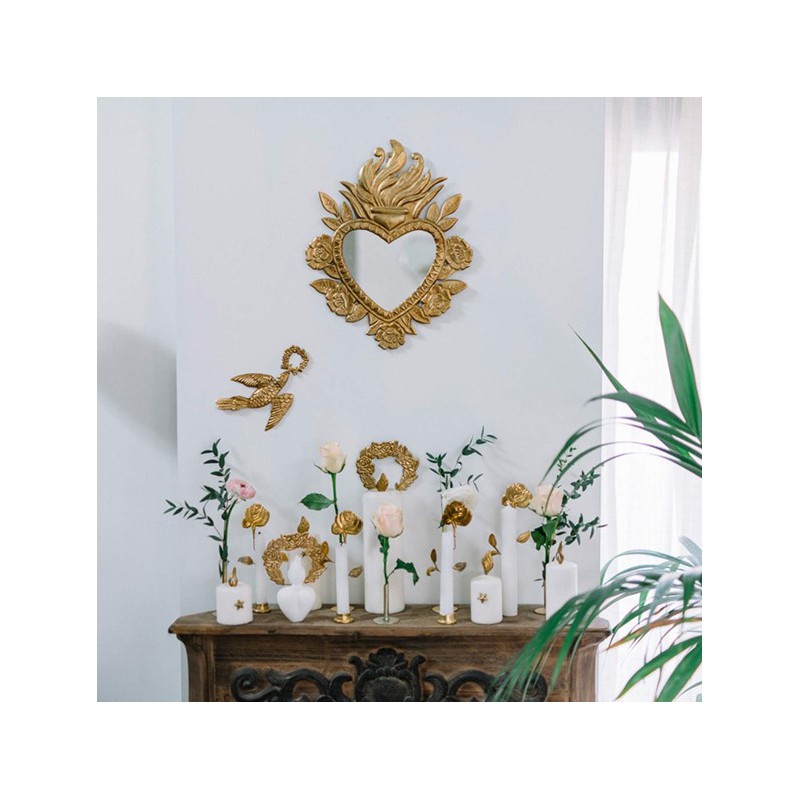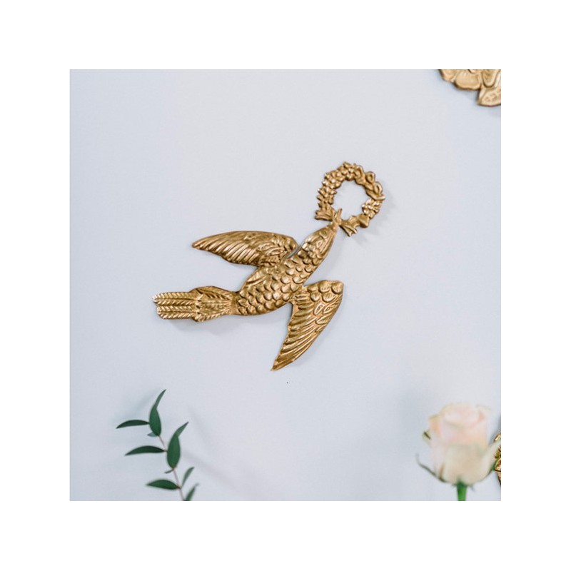 Ornement L’oiseau de la marque BONCOEURS. Cet oiseau en fer blanc embossé, avec sa patine dorée, ajoutera de la poésie à votre décoration murale. Vous pouvez mixer cet ornement avec le miroir coeur Narcisse.