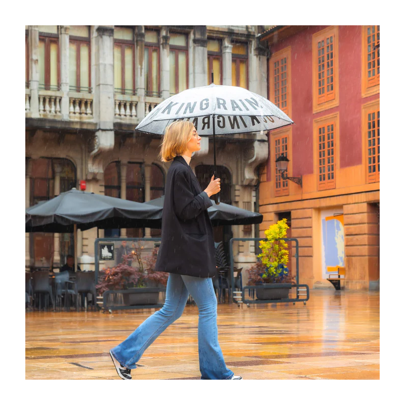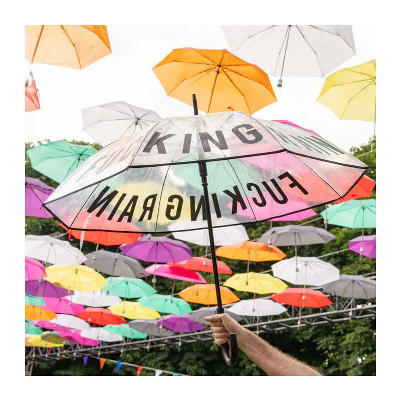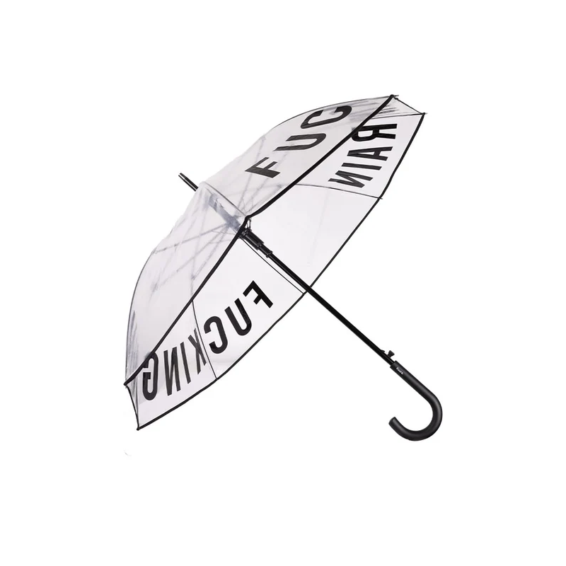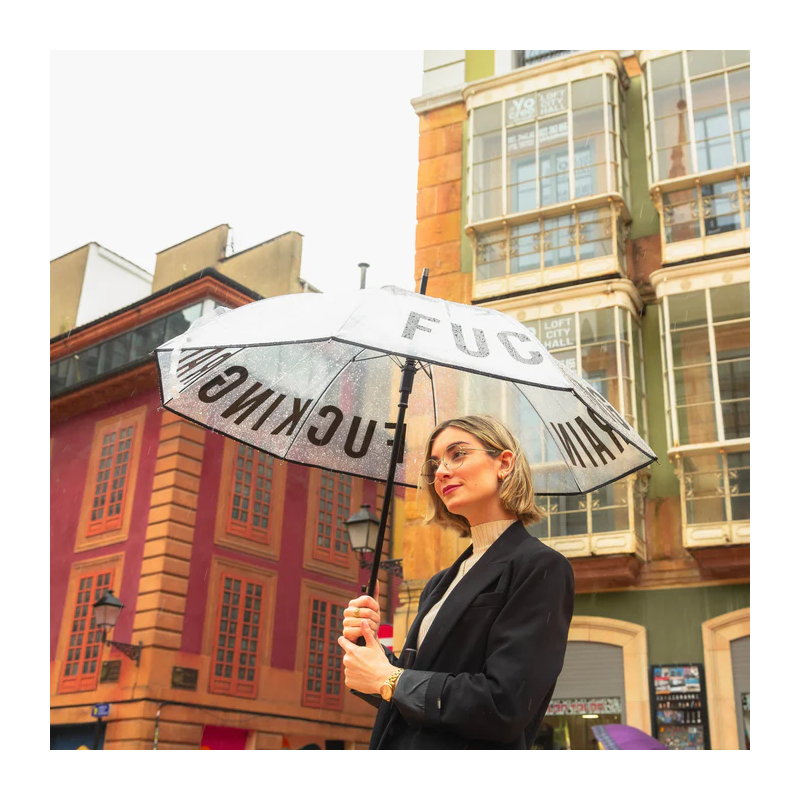 Ne laissez pas la pluie gâcher vos projets ! Prenez votre grand parapluie transparent avec le message « putain de pluie » dessus et marchez sous l'eau sans rien manquer de ce qui se passe autour de vous tout en précisant que vous détestez le mauvais temps.