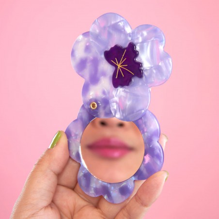 Pour checker sa dentition post-déj, on sort discretos ce miroir de poche en forme de pensée violette. Une bien belle fleur tout en effets & nuances de mauve, qui se glisse facilement dans un sac à main ou une banane.