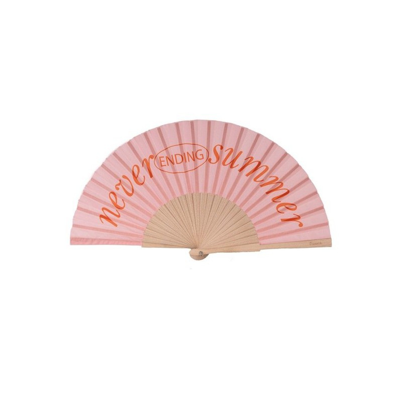 Des journées ensoleillées, des couchers de soleil à n'en plus finir et des soirées festives qui durent éternellement... C'est votre rêve, et vous l'afficherez clairement avec cet éventail au message « un été sans fin » ! De plus, avec son texte orange, cet éventail rose apportera une touche mignonne et amusante à votre look. Éventez-vous, vivez l'instant présent et faites de l'été un été sans fin ! 💕
