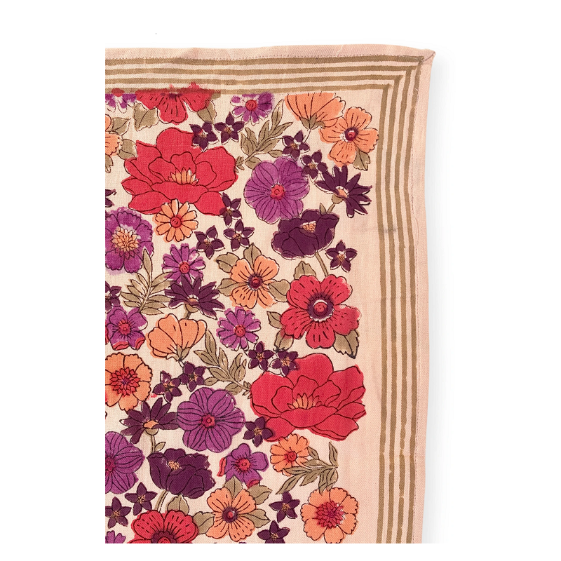 Le block-print indien consiste à imprimer à la main, grâce à des tampons taillés dans le bois, des motifs aux couleurs réalisées à partir d'un mélange de pigments naturels. Respectueux de l'environnement, ce tissu ne contient aucun produit chimique car les couleurs sont fixées grâce à un mélange d'eau et de vinaigre blanc.