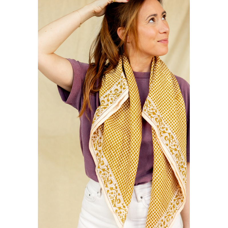 En raison du procédé de teinture naturelle utilisé, le foulard peut déteindre par frottements sur d'autres matières. Nous vous recommandons de le laver à la main seul avant de le porter pour la première fois