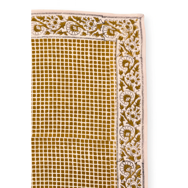 Le block-print indien consiste à imprimer à la main, grâce à des tampons taillés dans le bois, des motifs aux couleurs réalisées à partir d'un mélange de pigments naturels. Respectueux de l'environnement, ce tissu ne contient aucun produit chimique car les couleurs sont fixées grâce à un mélange d'eau et de vinaigre blanc. Cette confection manuelle peut entraîner certaines "irrégularités" dont nous aimons le charme ♡