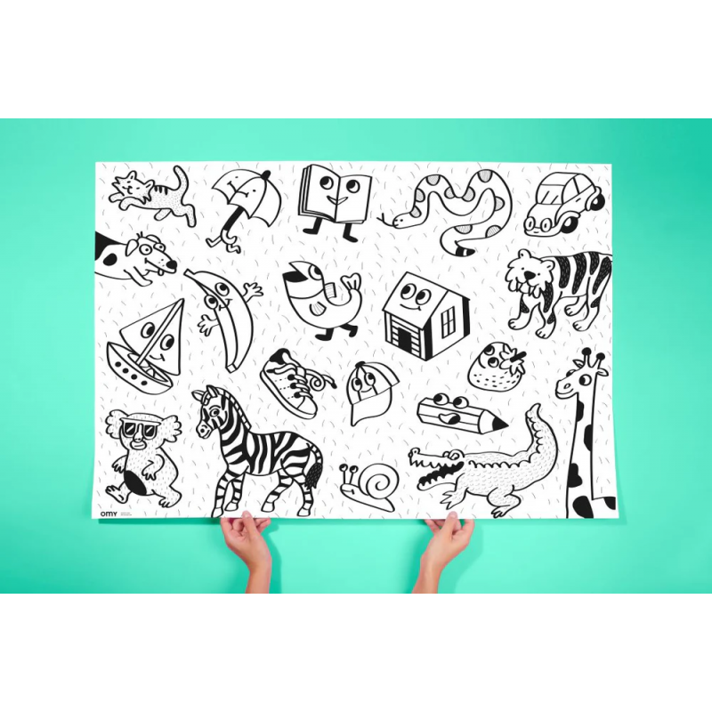 Un poster géant avec de grandes illustrations pour laisser les plus petits exprimer leur créativité avec des feutres, des crayons cires ou de la peinture.