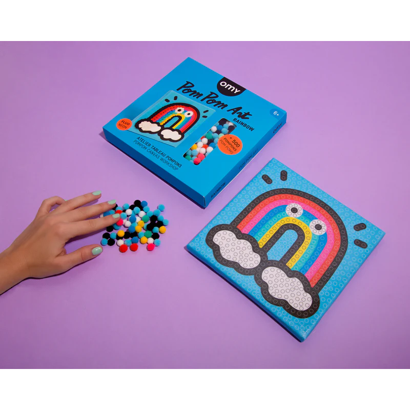 Contenu : 1 toile sur châssis bois + de 500 pompons colorés pou faire un arc-en-ciel
