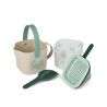 Dimensions: Pichet : hauteur (cm) 14 ; largeur (cm) 17 ; longueur (cm) 23,5. Seau : Hauteur (cm) 12,5 ; Largeur (cm) 15 ; Longueur (cm) 16. Tamis : hauteur (cm) 3 ; largeur (cm) 16,5 ; longueur (cm) 16,5. Entonnoir : Hauteur (cm) 12 ; Largeur (cm) 16,5 ; Longueur (cm) 25. Pelle : Hauteur (cm) 3 ; Largeur (cm) 9 ; Longueur (cm) 22,5