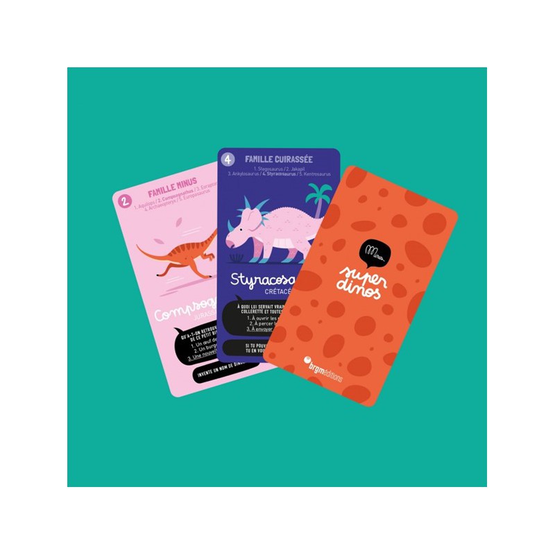 Chaque carte propose 1 QCM rigolo + 1 question ouverte sur un dinosaure