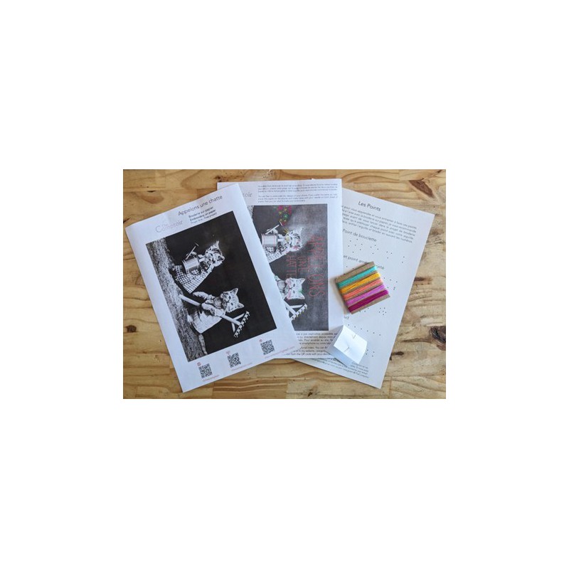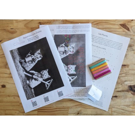 Ce projet est un projet guidé, ce qui signifie que sur la photo vous trouverez, d’imprimé, des pictogrammes correspondants à différents points de broderie. Tous les points de broderie sont expliqués dans le tutoriel vidéo qui accompagne le kit.