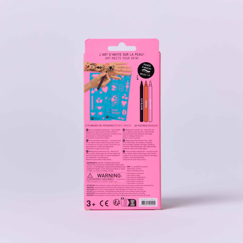 Le kit comprend 25 pochoirs pour vous guider ou vous inspirer dans vos créations. Parfaits pour créer des tatouages temporaires uniques, à main levée ou avec les pochoirs.
