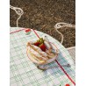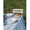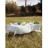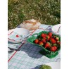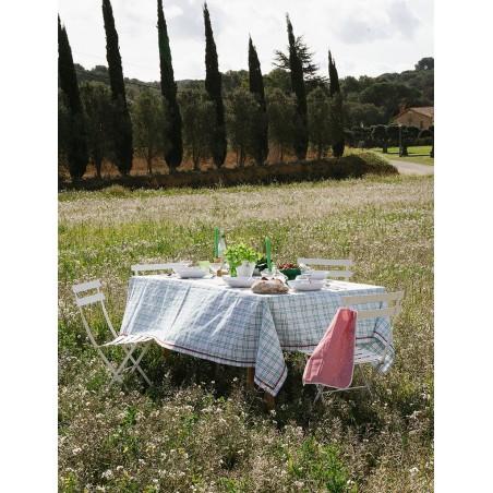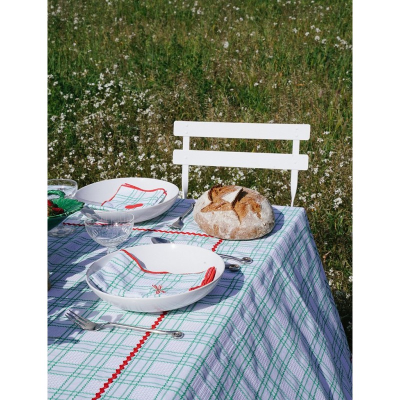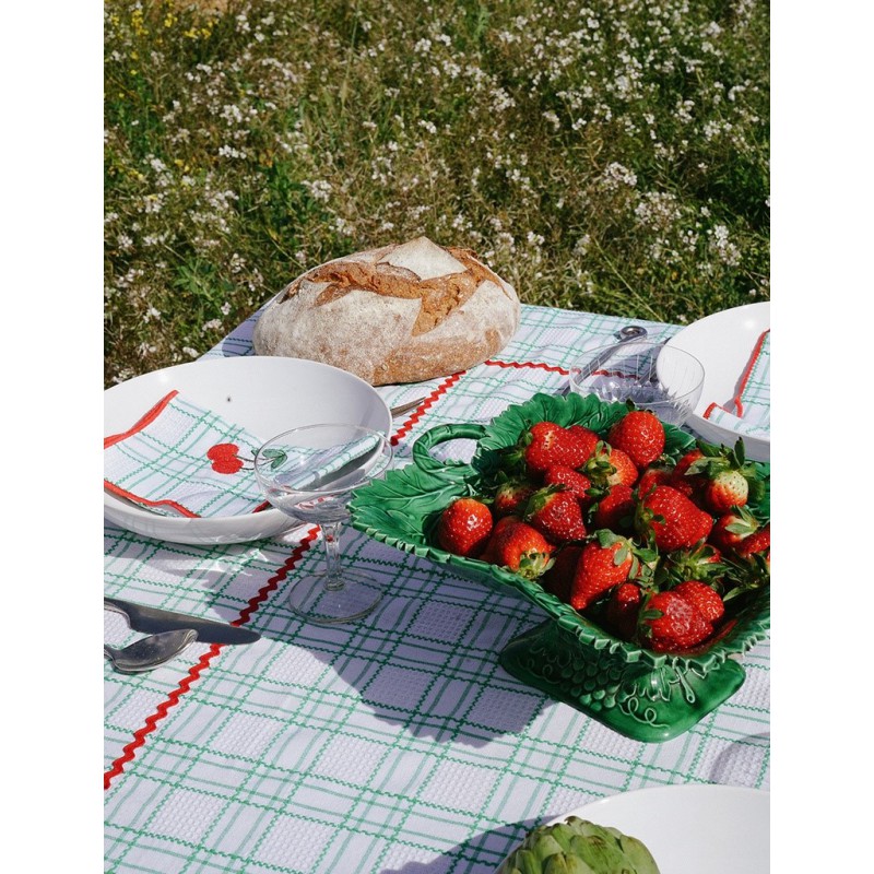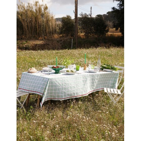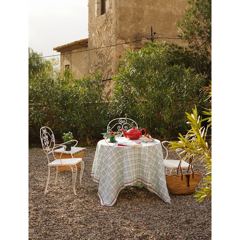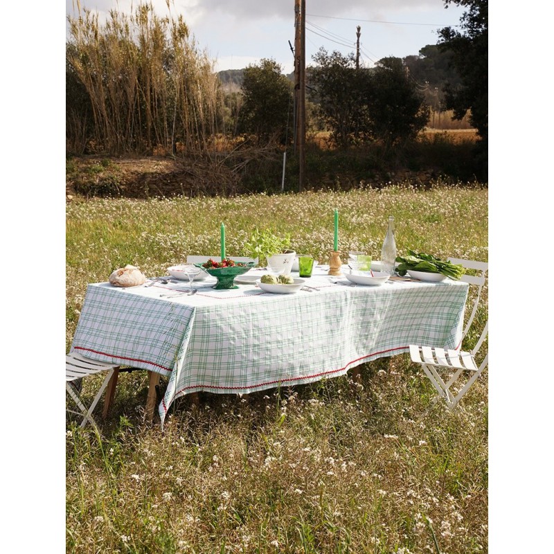 Nappe à carreaux verts en 100 % coton, avec des broderies rouges colorées et estivales.