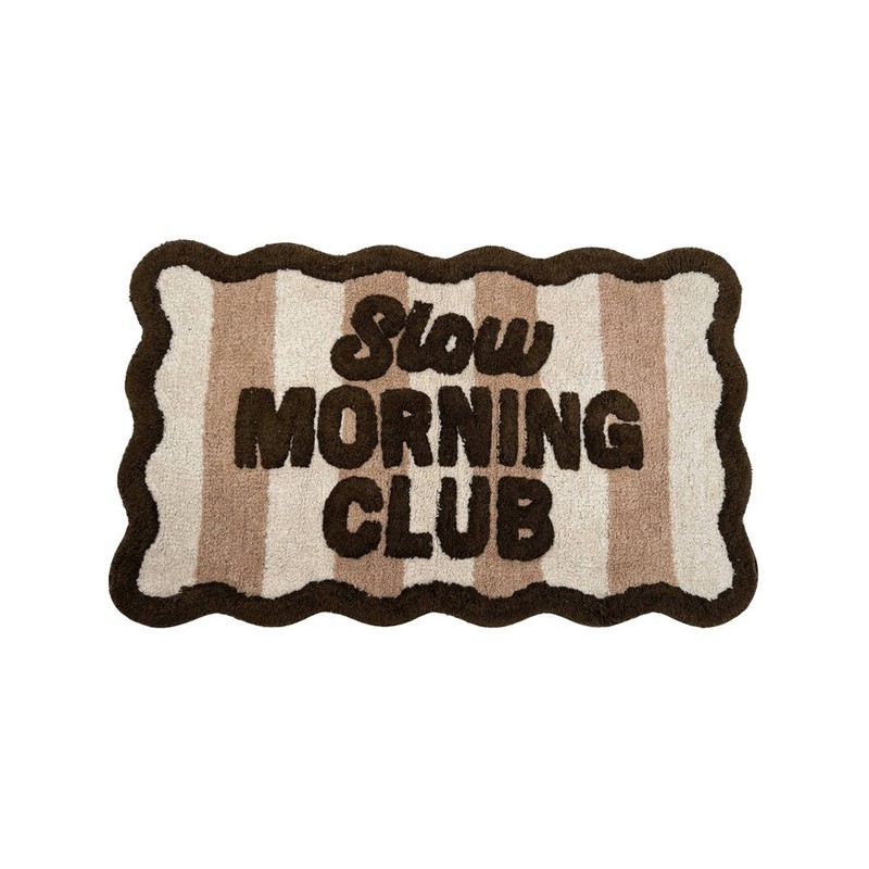 Ce tapis de bain en coton orné de l'inscription « Slow Morning » invite à la détente et à la sérénité. Son design multicolore lui confère une ambiance chaleureuse et décontractée.