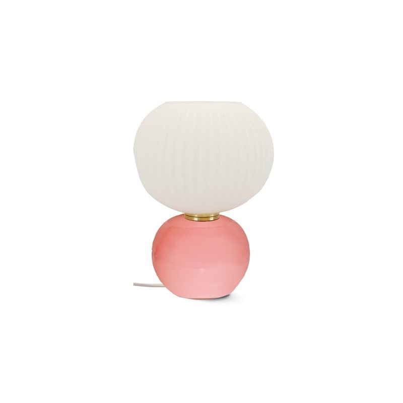 Lampe de bureau décorative avec base en verre brillant rose et abat jour en verre mate strié blanc.
