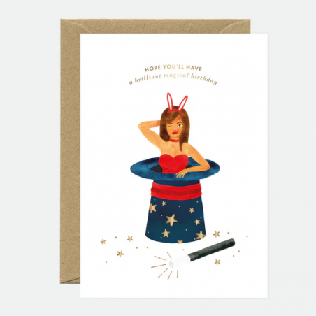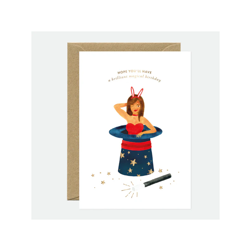 Abracadabra, c'est la magie de l'anniversaire ! La carte d'anniversaire magique de All the Ways to Say arbore un design éblouissant avec un chapeau de magicien, des oreilles de lapin espiègles et des détails dorés scintillants. Une carte qui transforme n'importe quel anniversaire en un moment magique.
