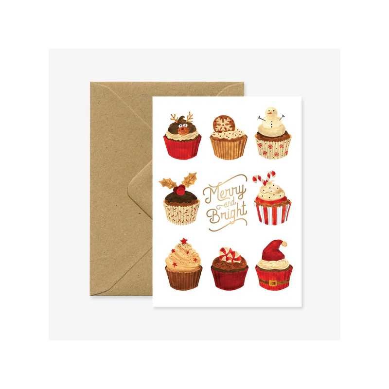 La carte de vœux Cupcakes de Noël de All the Ways to Say présente un délicieux assortiment de cupcakes festifs décorés de rennes, de bonhommes de neige, de bonnets de Père Noël, de houx, de cannes de bonbon et d'étoiles. Avec son message joyeux « Joyeux et Lumineux », c'est la plus douce des façons de répandre la joie de Noël.