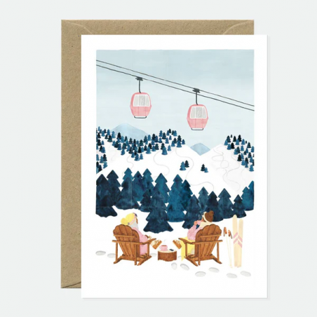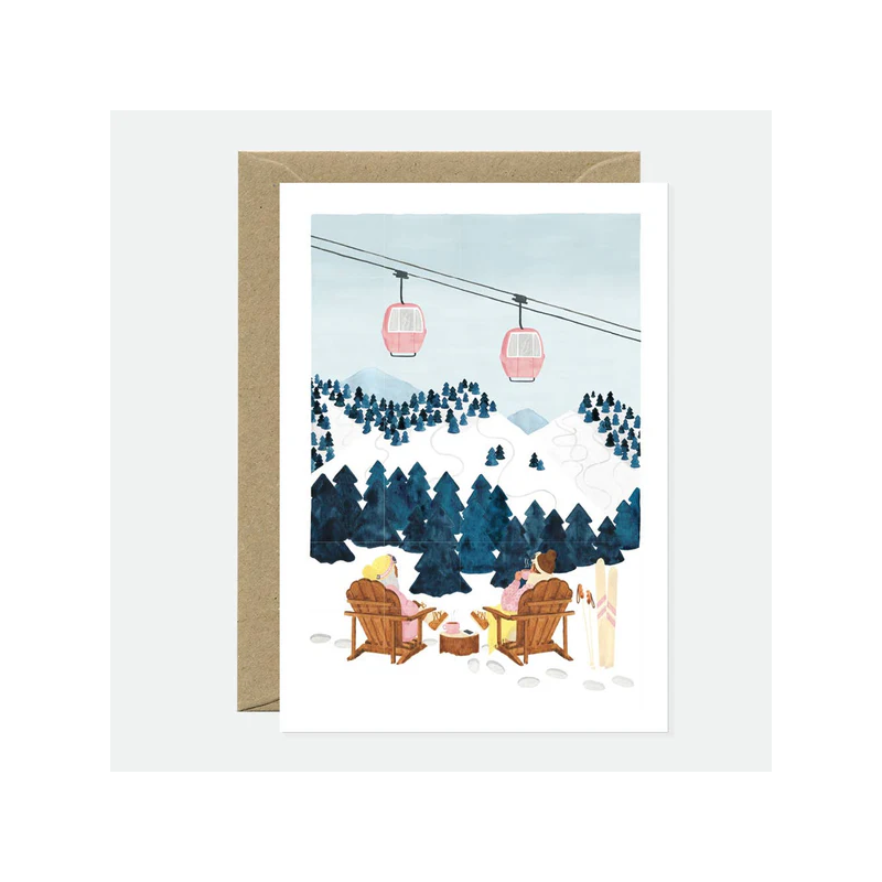 Évadez-vous à la montagne ! La carte de vœux Alpes de All the Ways to Say capture le charme douillet d'un refuge hivernal. Mettant en scène deux personnes se détendant dans des chaises en bois au bord des pistes enneigées, tandis que des téléphériques roses survolent la forêt de pins, ce motif évoque à la fois l'aventure et la sérénité au cœur des Alpes.