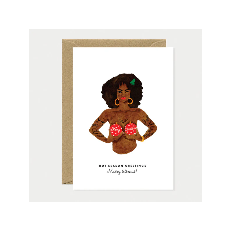 Une touche d'humour pour les vœux de fin d'année. La carte « Merry Titsmas » de All the Ways to Say apporte une touche d'humour à cette période avec une illustration audacieuse d'une femme confiante tenant des décorations de Noël.