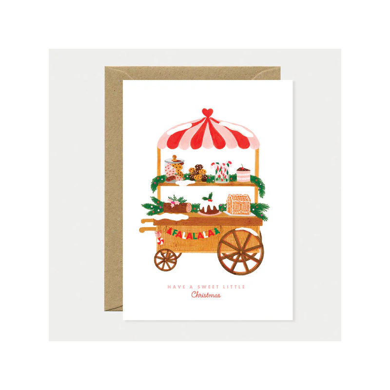 Une petite douceur festive pour les fêtes. La carte « Petit Noël » de All the Ways to Say capture la magie des fêtes avec un charmant chariot de desserts rempli de pain d'épices, de gâteaux et de gourmandises festives sous un dais rouge et blanc.