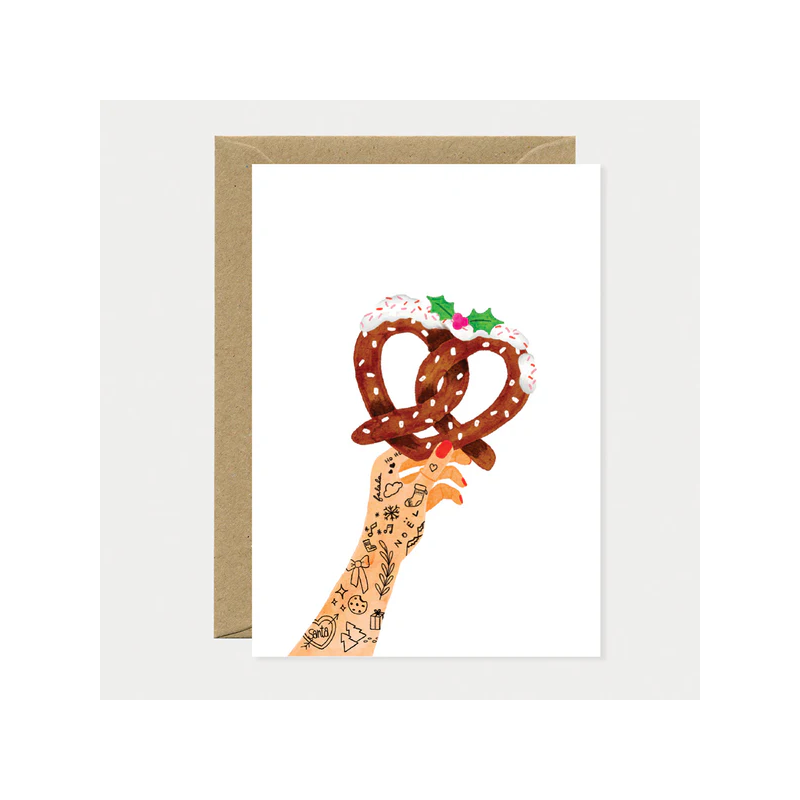 Une touche festive et sucrée. La carte Bretzel de Noël de All the Ways to Say représente une main tenant deux bretzels recouverts de sucre et de feuilles de houx, alliant charme festif et design ludique.