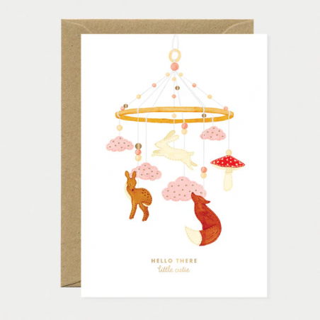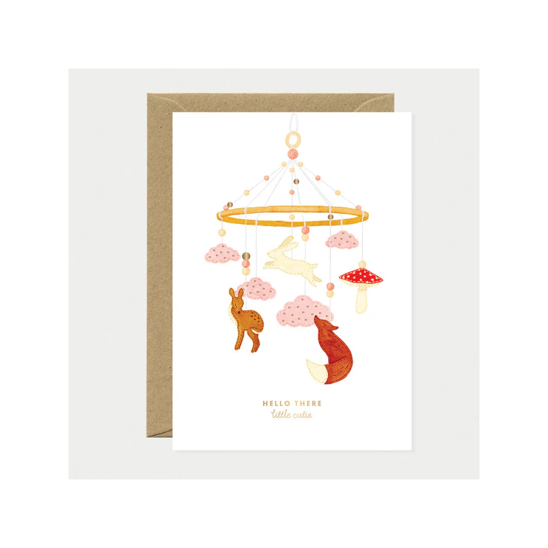 Un accueil chaleureux pour les tout-petits. La carte de vœux « Hello There Cutie » de All the Ways to Say présente un adorable mobile orné d'animaux de la forêt, de doux nuages et de champignons, parfait pour célébrer l'arrivée d'un bébé.