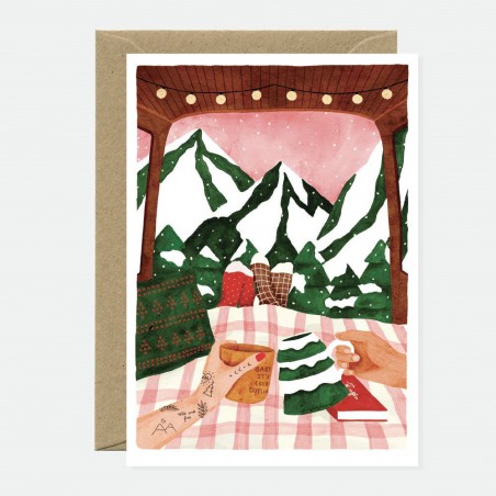 Chérie, il fait froid dehors, mais la vue est parfaite. La carte Van Life d’All the Ways to Say illustre la chaleur des instants partagés sur la route. Avec ses montagnes enneigées, sa nappe à carreaux et ses deux tasses sous un auvent en bois, cette scène rend hommage aux petits plaisirs, à l’aventure et aux moments à deux.