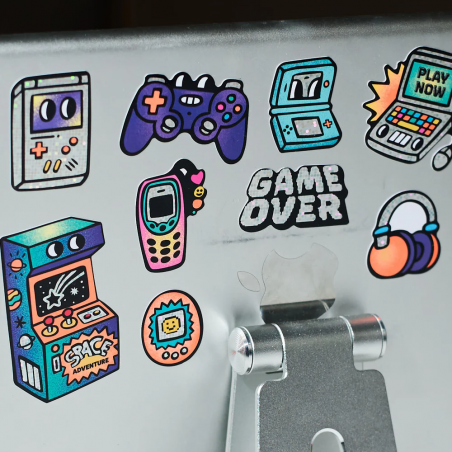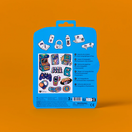 Prêt(e) à jouer ? Avec cette planche de stickers, retrouve des consoles, des manettes, des bornes d’arcade et des messages pixelisés rigolos.