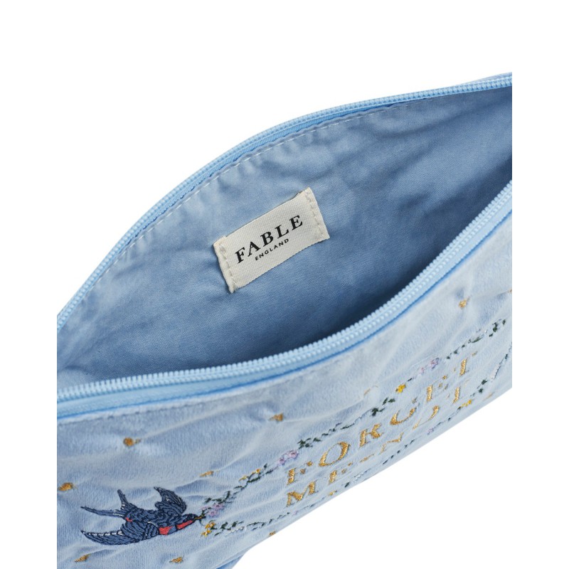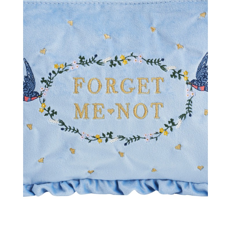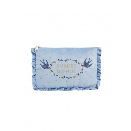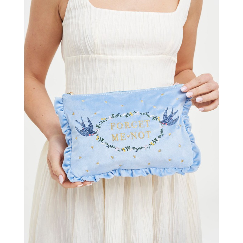 Gardez vos précieux objets à portée de main grâce à la pochette brodée en velours bleu « Myosotis ». Confectionnée en velours bleu ciel d'une douceur incomparable, cette charmante pochette est ornée de notre motif signature : des oiseaux bleus portant une couronne de fleurs brodée de l'inscription « Myosotis », une douce ode à l'amour et à la beauté paisible de la nature. Bordée de délicats volants et s'ouvrant sur un compartiment principal spacieux, elle est aussi ravissante par ses détails que pratique par son utilité.