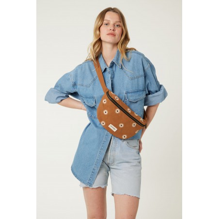 Custine le sac banane s’habille ici d’un coton recyclé camel, délicatement brodé de tournesols beiges, pour un look doux et naturel.