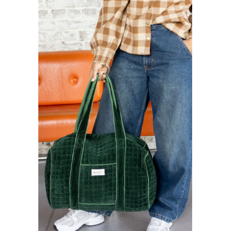 Optez pour le sac Buddha Vert Forest en velours lisse, alliant douceur et élégance naturelle. Parfait comme sac à langer ou sac 48h, il offre un grand espace de rangement avec ses poches plaquées. Souple et raffiné, il vous accompagne au quotidien avec style et praticité.