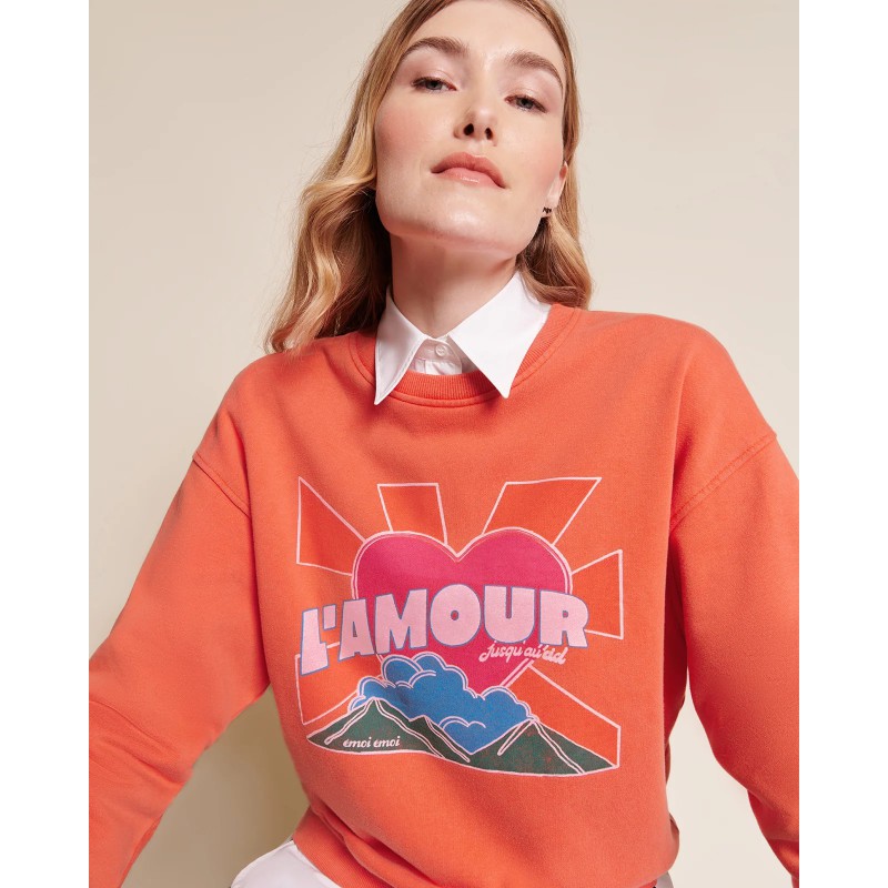 Le sweat qu’on aime jusqu’au ciel. Orange lumineux comme un coucher de soleil, molleton de coton bio qui atteint des sommets de douceur… Coup de coeur pour la finition délavée “garment dye” et son côté vintage.