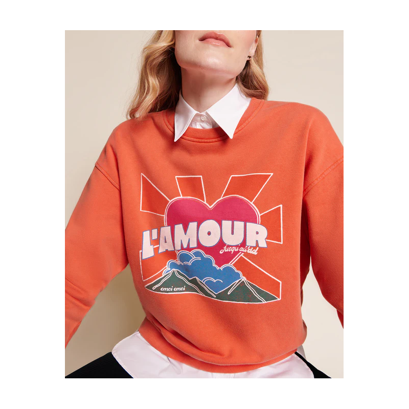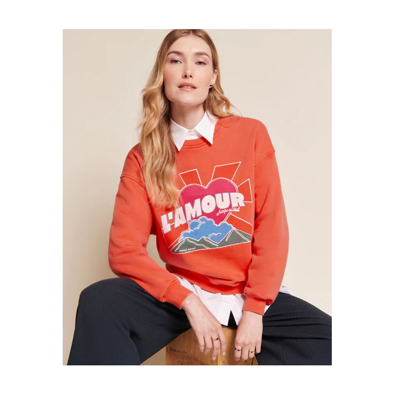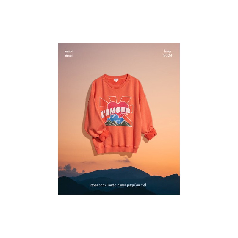 Le sweat qu’on aime jusqu’au ciel. Orange lumineux comme un coucher de soleil, molleton de coton bio qui atteint des sommets de douceur… Coup de coeur pour la finition délavée “garment dye” et son côté vintage.
