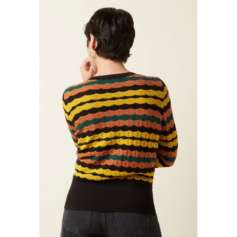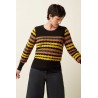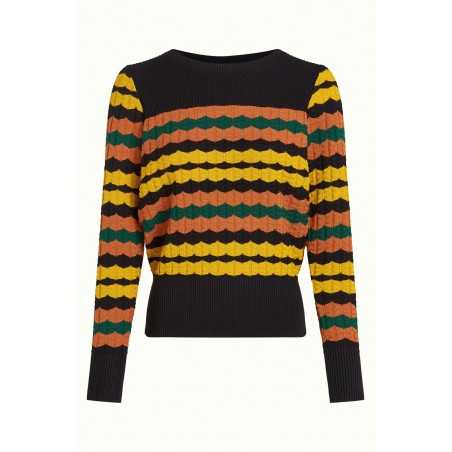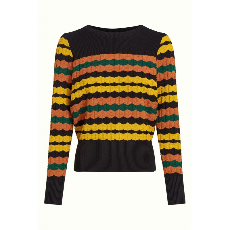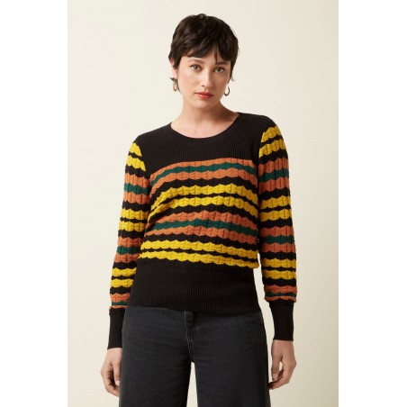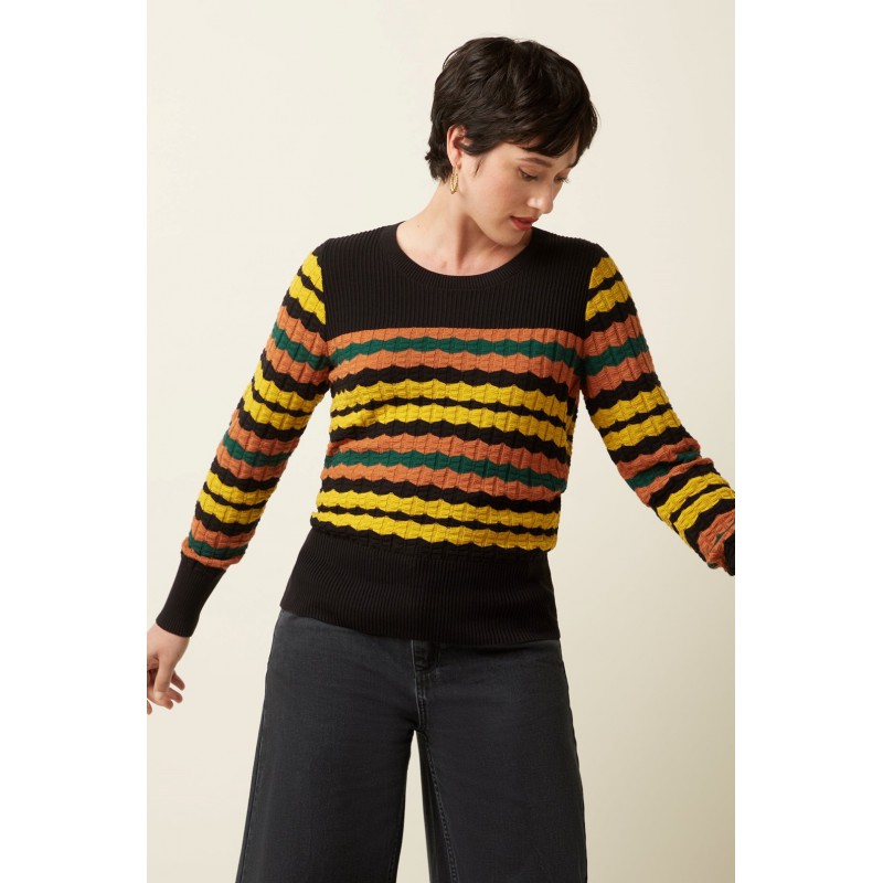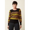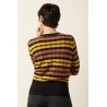 Le haut Bella Royal présente des ourlets et des poignets côtelés, confectionnés en maille de coton extensible. Avec ses manches longues et son col rond classique, il offre un look confortable et élégant, parfait en toute occasion.