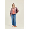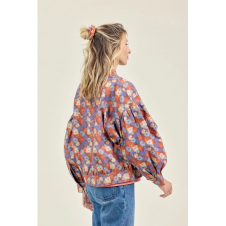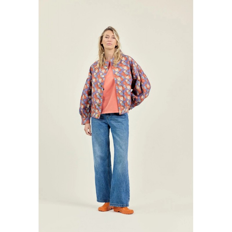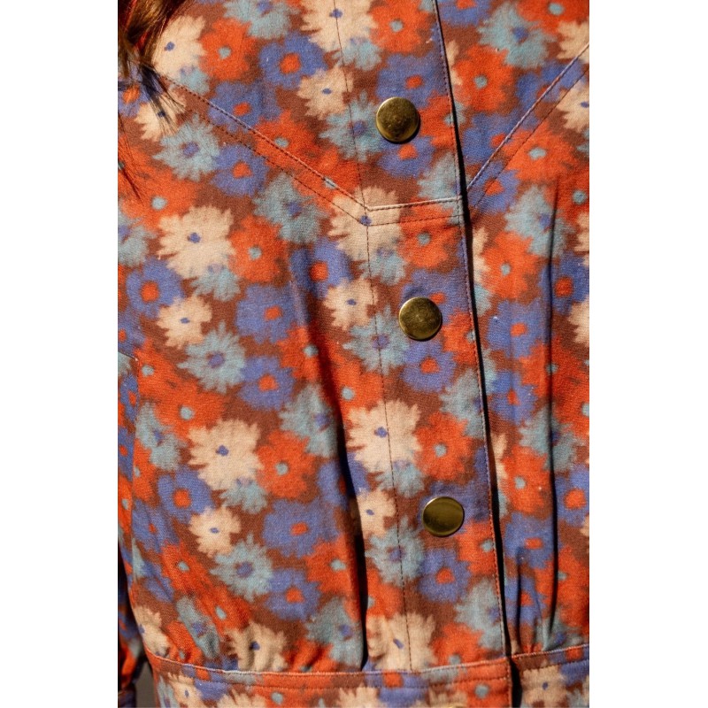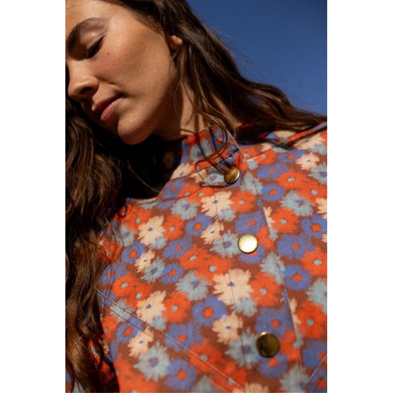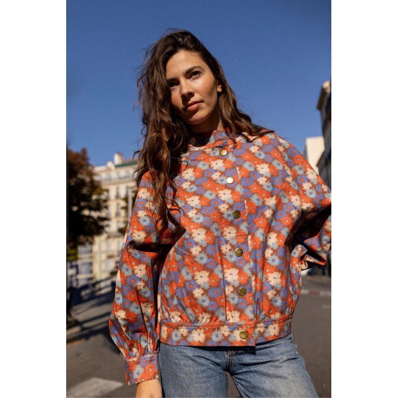 La veste VIVAI en coton épais allie confort et style avec sa coupe boule ample, légèrement resserrée à la taille. Ses manches ballon se ferment aux poignets par pressions, tandis que le col montant et les grosses pressions dorées à l’avant apportent élégance. Poches passepoilées et empiècement triangulaire structurent le devant et le dos.